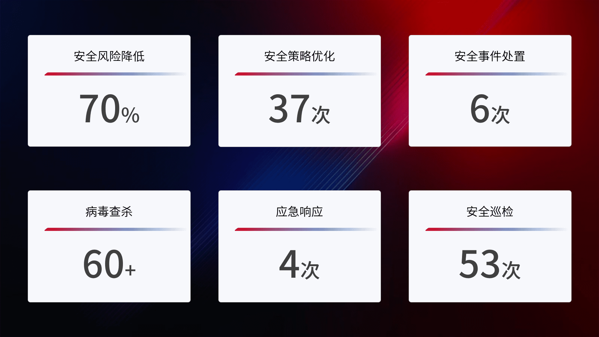 提供全面的安全事件报告体系,,包括处置报告、、周报、、季度和年度总结,,,,结合持续监控,,,,帮助客户深入了解网络安全状况。。