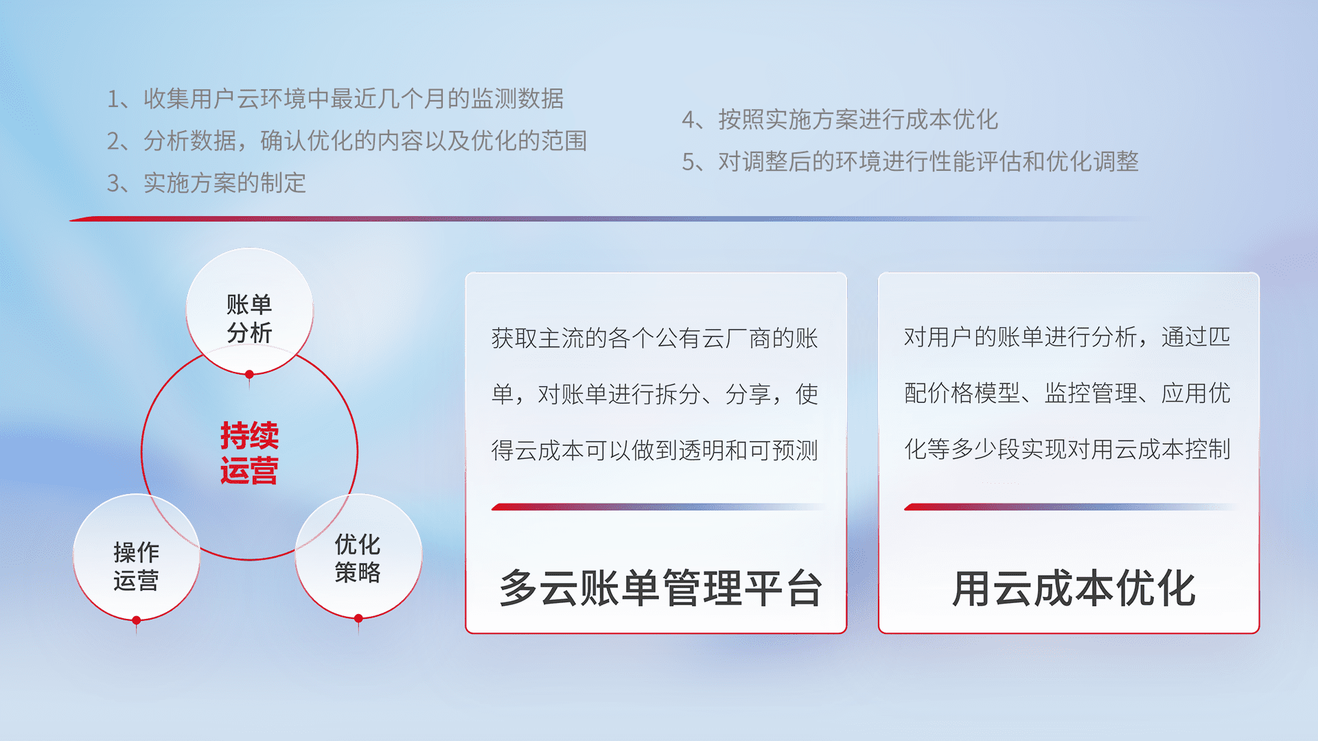 通过多云纳管,,以统一的资源数据模型把客户的云资源进行抽象和封装,,进而实现对多云资源的统一操作,,保障云资源管理的可靠性、、稳定性与可用性。。。。量身定制化运维内容,,,配置、、、开发运维、、、、补丁管理、、备份、、、、监控、、、、认证和访问管理、、、审计和日常巡检等,,保障在用云过程中的可靠度,,,,稳定度以及高可用率。。