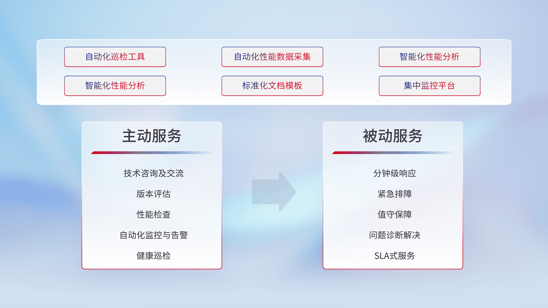 智能化工具和标准化文档,,保障服务质量,,,,提供主动服务(包含技术咨询、、、、版本评估、、性能检查、、、自动化监控与告警、、、、健康巡检)和被动服务包含(分钟级响应、、紧急排障、、、、值守保障、、、、问题诊断解决、、、SLA服务)。。。。